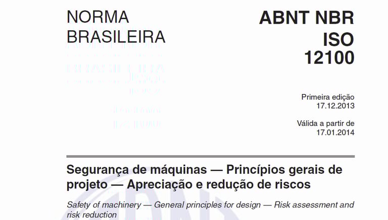 Ela segue diretrizes da ABNT NBR ISO 12100 e é citada diretamente na NR-12, norma que regulamenta a segurança no trabalho em máquinas e equipamentos no Brasil.